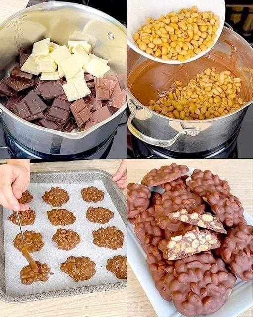 Do rondla dodaj chipsy czekoladowe, chipsy z białej czekolady, czekoladę do pieczenia, masło orzechowe i podgrzewaj delikatnie na małym ogniu przez 15–20 minut, od czasu do czasu mieszając.