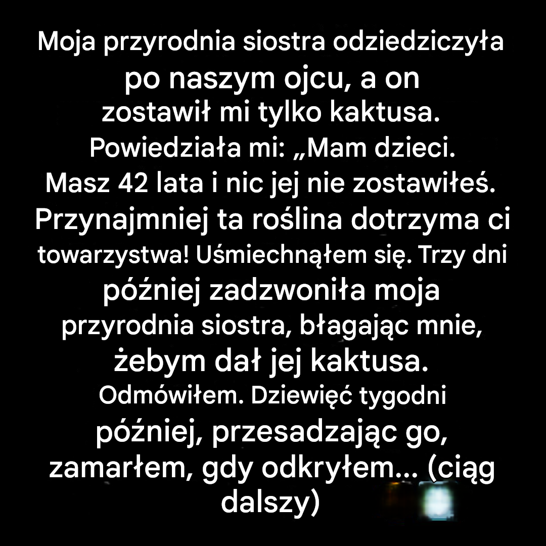 Kaktus. Ten, który zawsze stał pod oknem mojego ojca, lekko pochylony w stronę światła, trochę krzywy, ale niesamowicie wytrzymały. Moja przyrodnia siostra uśmiechnęła się rozbawiona. Miała dzieci, plany, pełne życie. Ja, 42-letnia, niezależna i samowystarczalna, z pewnością mogłabym odejść z rośliną.