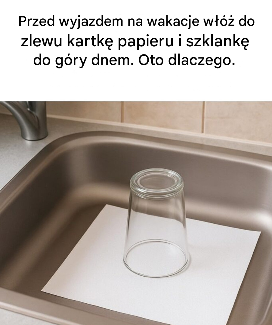 Myślimy o wszystkim przed wyjściem: zakręcamy wodę, opróżniamy lodówkę, nastawiamy budzik. Ale co ze zlewem? Często o nim zapominamy. A jednak to właśnie tam często pojawiają się nieprzyjemne niespodzianki. Nieprzyjemne zapachy, wilgoć, owady… Na szczęście istnieje bardzo prosty trik, sprawdzony przez profesjonalistów, darmowy i bardzo skuteczny: połóż szklankę do góry dnem na kartce papieru w zlewie. Mały gest, który może zdziałać cuda.