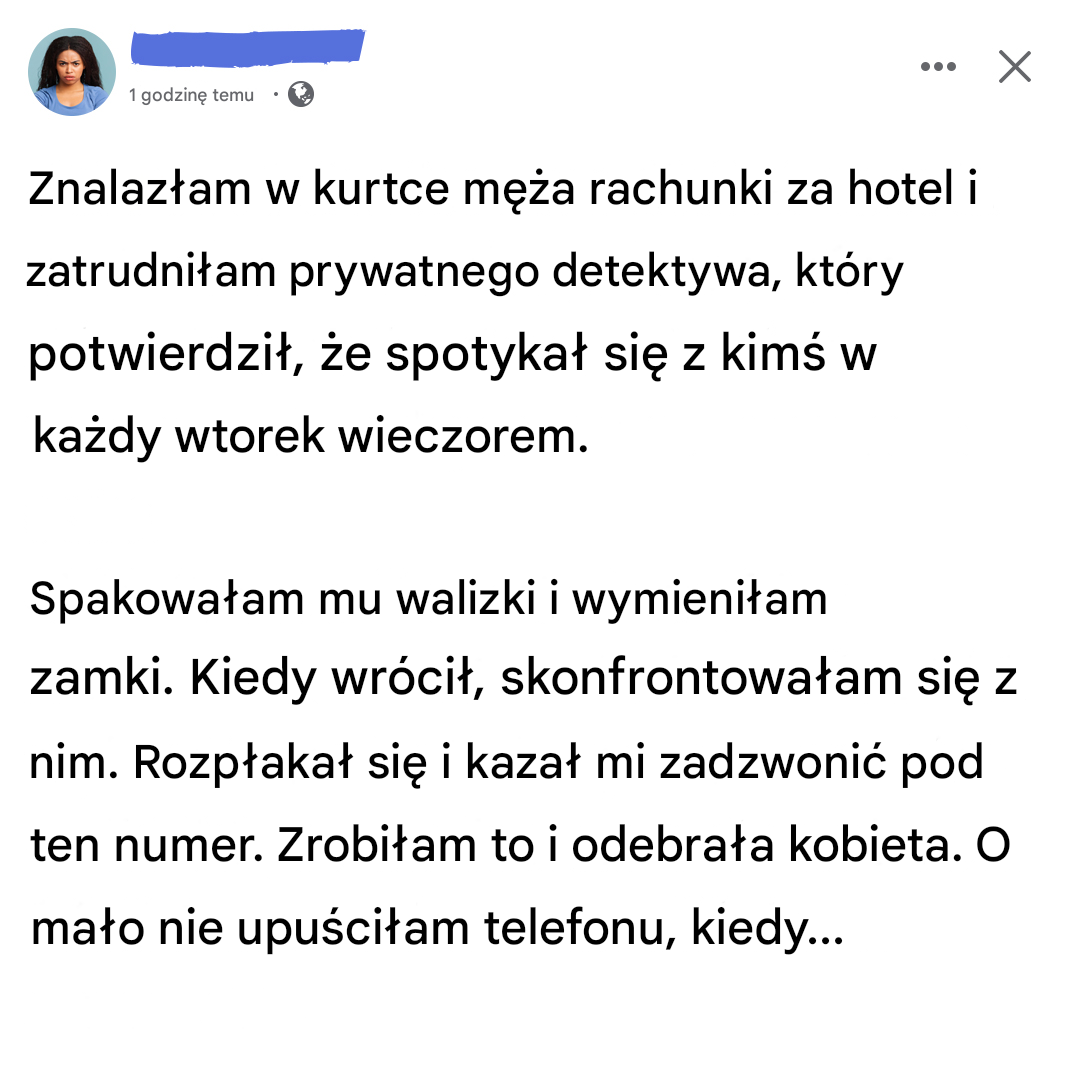Prosty rachunek hotelowy wystarczył, by zachwiać piętnastoletnią pewnością siebie. W obliczu niepokojących pozorów myślałam, że odkryłam zdradę… nie wyobrażając sobie, że prawda wywróci moje małżeństwo do góry nogami na tak wiele sposobów. Kiedy znalazłam pierwszy rachunek hotelowy w kurtce męża, poczułam ten znajomy chłód: ten, który mrozi krew w żyłach, zanim umysł zdąży go przeanalizować. Randka. Wtorek. Potem drugi rachunek. Kolejny wtorek. I nagle wszystko, co uważałam za solidne w moim małżeństwie, zaczęło się sypać.